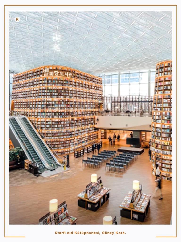 Güney Kore’de Starfi eld Coex’de 2017’de hizmete açılan Starfi eld Library ise AVM kütüphanelerinde gelinen son gelişmeleri göstermektedir. 2800 m2 alana sahip iki katlı kütüphane halka açık, ücretsiz olarak hizmet vermektedir. Kütüphane, yaklaşık 50 bin kitap ve dergiyle dolu 3 adet 13 m boyunda dev kitaplıktan oluşmaktadır.