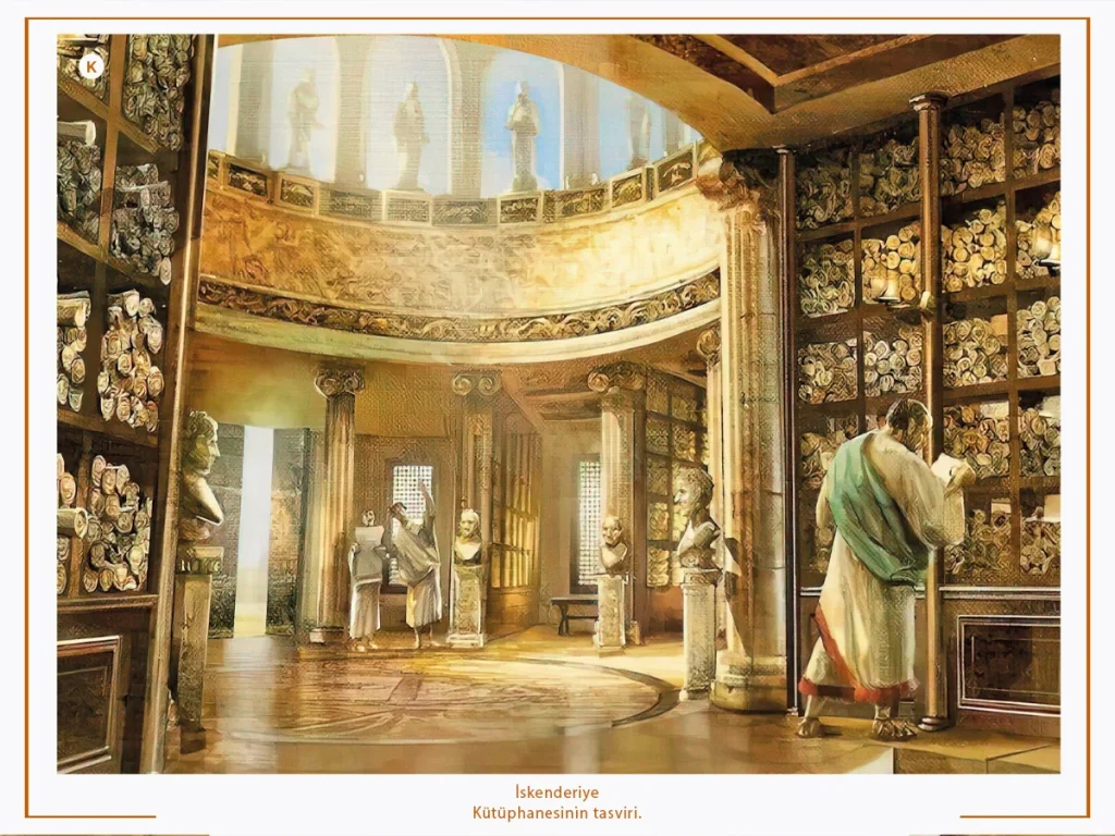 Kelimenin bugünkü anlamında kullanılması ilk kez İskenderiye Kütüphanesi için sözkonusu olmuştur. Burada he megale bibliotheke6 gibi tekil şekli yanında “kai ton an Aleksandreia bibliothekon ton prouste” olarak çoğul halinde kullanıldığını da görüyoruz.