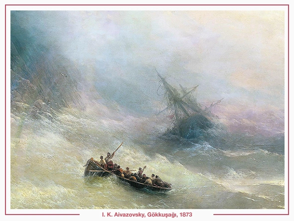 Ivan Aivazovsky, zaman üzerine sorgulamalar yapan bir ressamdır. Ressamın “Açık Denizde Gemiler” adlı resmi, sis içinde yitip gitmekte olan fâni insanı betimler. Her tuvalde insanın betimlenmesi bambaşka şekillerde olur. Saego’nun “Kıyı Boyu Tekneler, Norfolk” resminde insan, kıyıda resmedilmiş kayıktır. Suyun yaydığı bereket, tuvaldeki fırça darbeleri ve renk yoğunlukları ile betimlenebilir. Tuvallerdeki ırmaklar, ressam tarafından hem havaya hem de geçen zamâna birleştirilir.