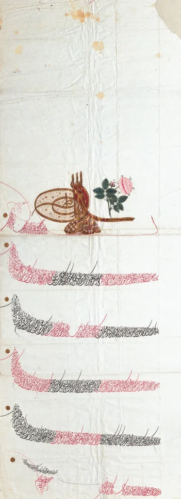 5. Genellikle tuğranın üstünde veya sağında yer alan hattı hümâyûn, devrine göre klasik tezhip veya rokoko motiflerle süslenmiştir.