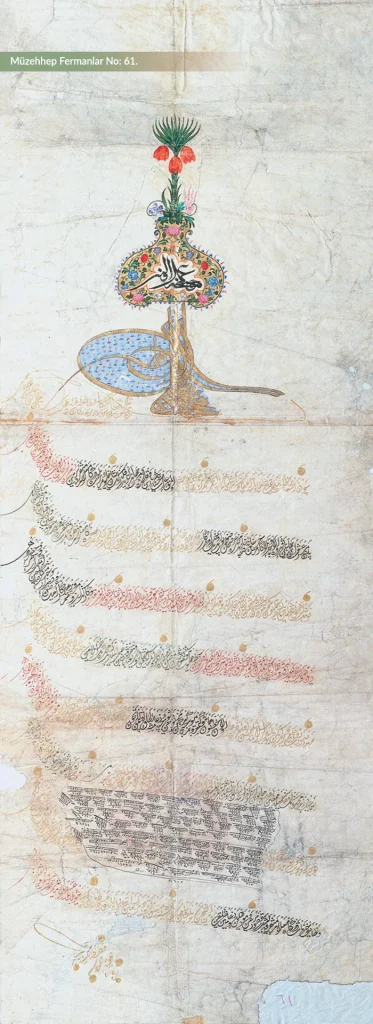 1735 tarihli ve 61 numaralı fermandaki çiçekler, tarama boyamanın (fırça ile ışık gölge vermek) güzel bir örneğidir. “Mucibince amel oluna” yazısının etrafında yer alan, gül, menekşe, kasımpatı ve peygamber çiçeği, altın zemin üzerine çalışılmıştır. Tepedeki çiçek ise ters lâle de denilen ağlayan gelindir.3