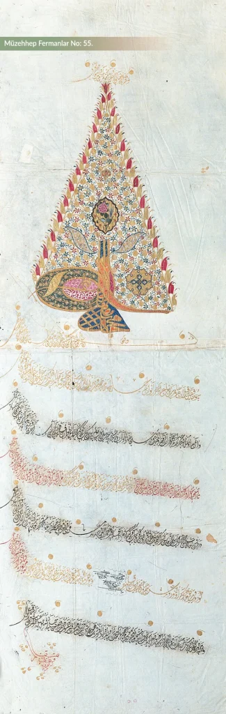 Fermanların süslenmesi, II. Bayezid Han döneminde tuğra beyzelerinin tezhiplenmesiyle başlamıştır. XVI. asır fermanlarındaki tuğralarda klasik tezhiple birlikte yarı stilize bahçe çiçekleri görülmeye başlamıştır. Yüzyılın sonuna doğru süsleme, tuğra dışına taşmış; yukarıya doğru üçgen biçimini almıştır. Selviden mülhem olan ve hayat ağacı da denilen bu form, bazı değişikliklerle XIX. asrın ortasına kadar devam etmiştir.