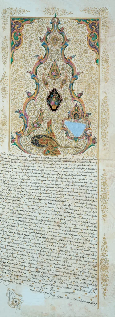 4. Mahall-i tahrir, yani fermanın nerede yazıldığını gösteren kısım, halkâr ve zerefşanla süslenmiştir.