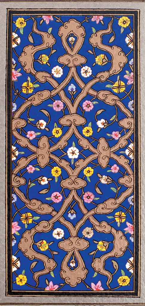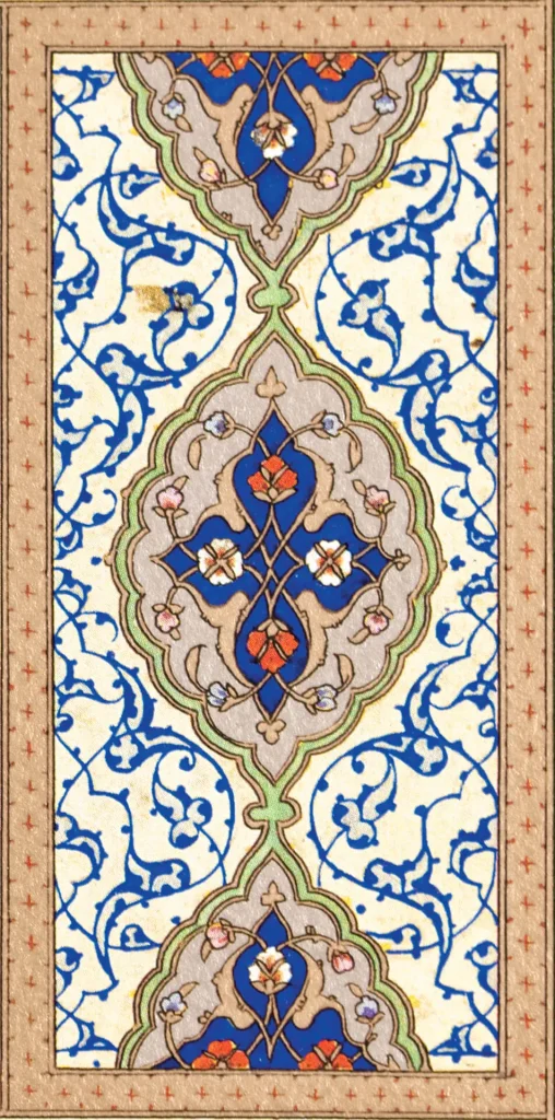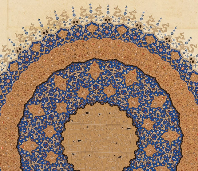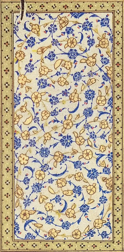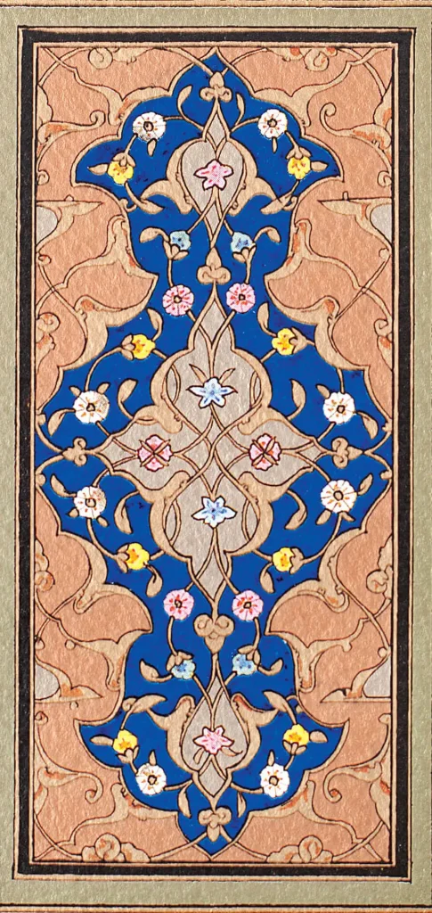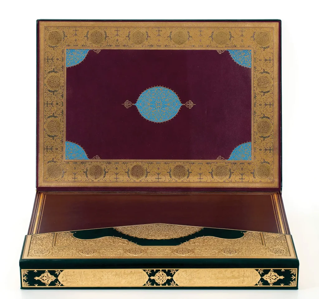 Aynı üslûpta tasarlanmış fakat daha küçük paftalar halinde genel olarak klasik usulde tezhiplense de Bakara Sûresi’ndeki bazı koltuklarda yarı üslûplaşmış (natüralist) çiçeklere rastlanır. Çift tahrir ya da negatif tekniğinde ise birçok koltuk tezhipse altın üzerine lacivert ve kırmızı renklerde karşımıza çıkmaktadır. Klasik motiflerden hatâî, penç, gonca, rûmî, hurdeli rûmîler, sarılma rûmîler detay detay çeşit çeşit işlenmiştir. Kur’ân’ın tezhibinde ve cetvellerinde çeşitli renklerde altınlar kullanılmıştır. Altın varak çeşitliliğin bir eserde en fazla kullanıldığı nadir örneklerdendir.