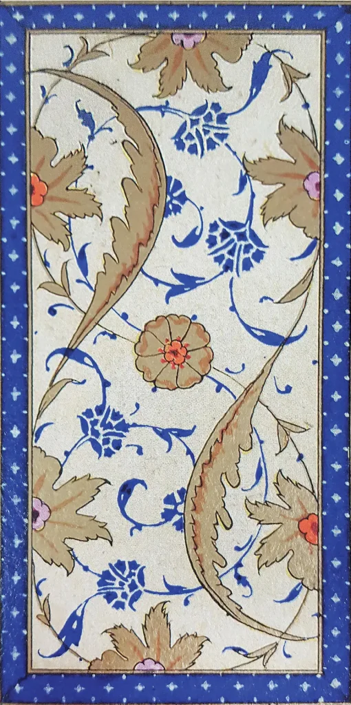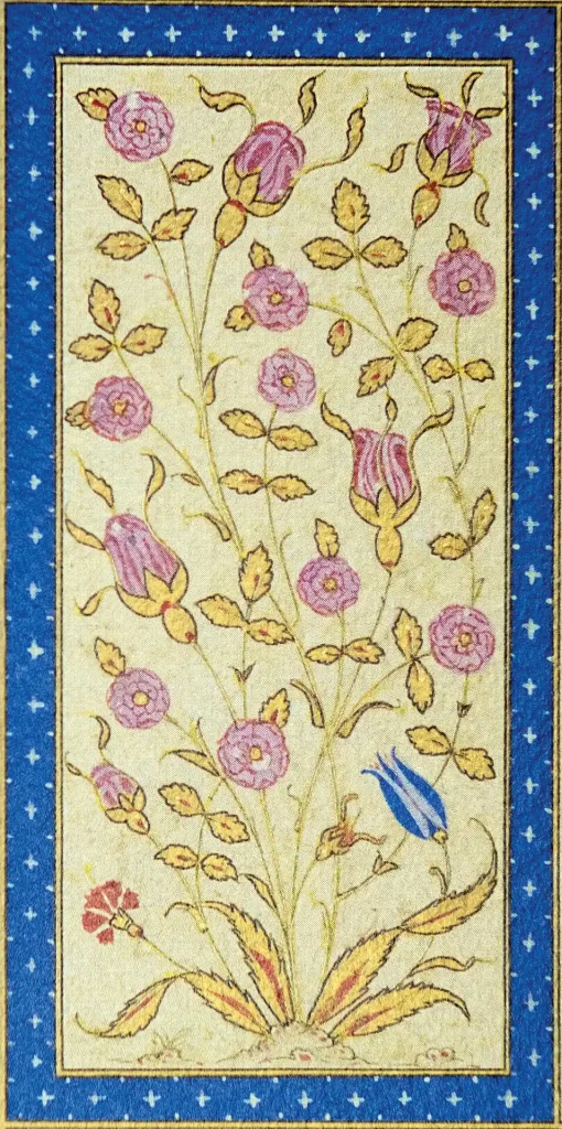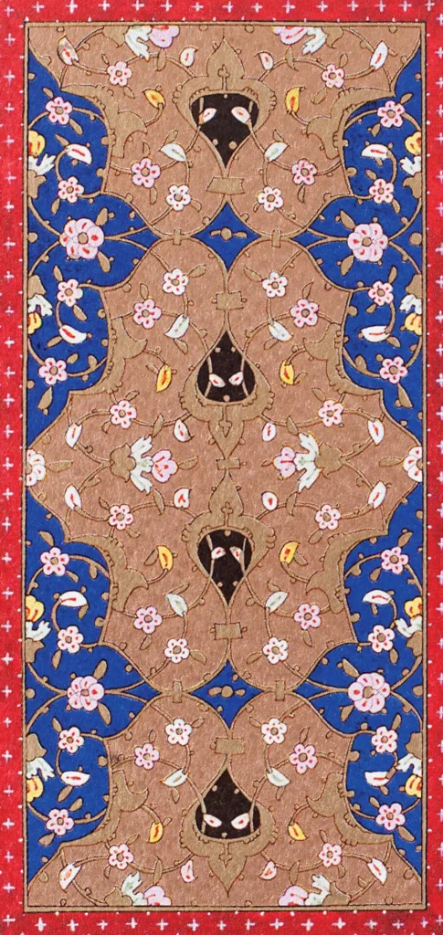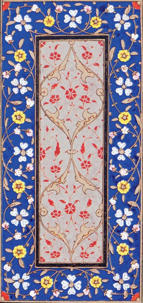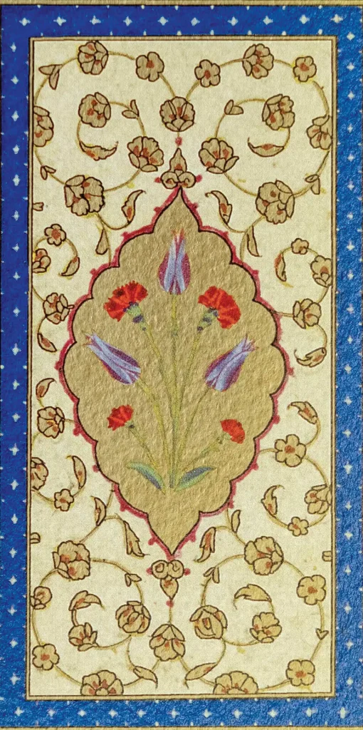 Eserin tezyînatında çalışan müzehhibler, Usta Cafer, Ali Çelebi, Nakkaş Hasan, Mustafa Nakkaş, Lütfi Abdullah ki, yöneticilik vasfında olduğu düşünülüyor. Kara Memi’nin öğrencisi olduğu düşünülen Mustafa Nakkaş Enderun’dan değil, dışarıdan gelip çalışan bir sanatçıdır. Mushafın tezhiplerinin dört saray nakkaşı ve öğrencileri tarafından yapıldığı düşünülmektedir. Mushafın tezhiplerinde klasik tezhibin yanı sıra müzehhib Kara Memi’nin çokça kullanmış olduğu yarı üslûplaştırılmış buketler ve çiçekler de kullanılmıştır. Bu çiçekler lâle, gül, karanfil üslûplaşmış ve yarı üslûplaşmış şekilde negatif ya da diğer bir tabirle çift tahrir üslûbunda tezyîn edilmiştir (şekil 1a). Bu kompozisyonda da görüldüğü gibi müzehhib Kara Memi’nin etkisi bariz bir şekilde belli olmaktadır (şekil 1b). Yarı üslûplaşmış çiçeklerle oluşturulmuş tasarımda tomurcuk, gonca ve tam olarak açılmış, üç renkte kullanılmış gülleri; hâkî renge yakın bir renkte kullanılan altınla işlenmiş dal ve yaprakları görmekteyiz. Yine kompozisyonun alt kısmında hançer yapraklar ve yaprakların arasına dalları gizlenerek çıkartılmış lâle ve karanfiller yer almakta. Burada kullanılan lâlelerin klasik İstanbul lâleleri olmamasını, o devirde henüz lâlelere dair bir yoğunlaşma olmamasına ve farklı lâlelerin üretilmeye başlanmamasına bağlıyorum.