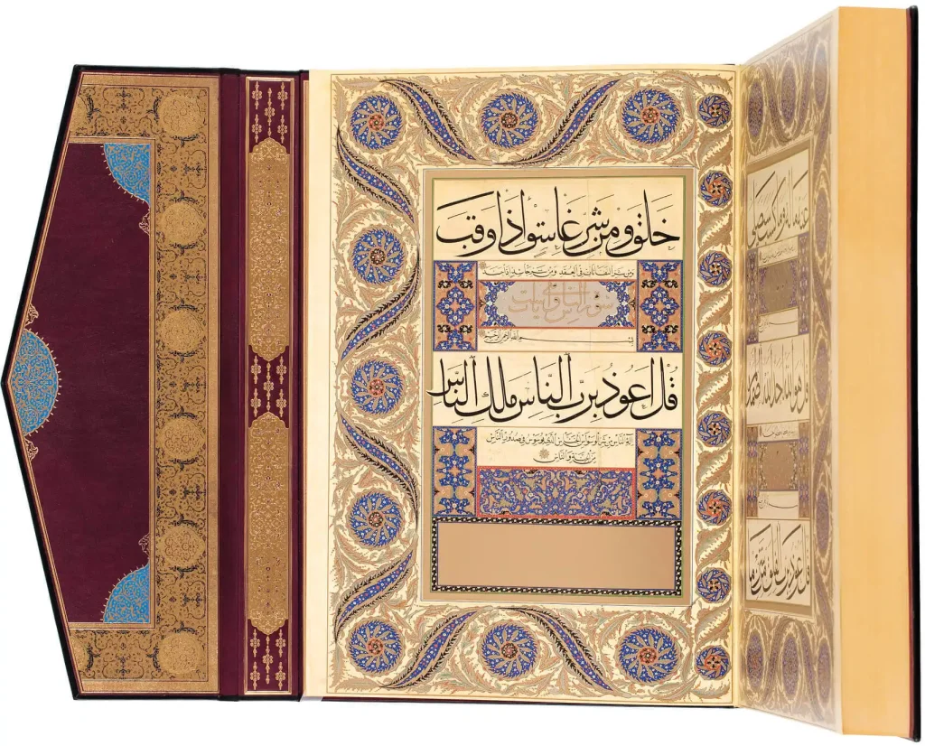 Mushaf, kendi alanında devrinin bir şaheseridir ki buna günümüzü ve günümüze kadar yazılıp tezhiplenmiş eserleri de dahil etmek mümkündür. Altın ve lacivert ağırlıklı, klasik üslûpta, mushafın bütün sahifeleri büyük bir denge ve ahenk içerisinde ince ince tezhiplenmiştir. Sayfa düzenine göre her sayfada dört adet koltuk ve sayfaların akışına göre sûre başları ve unvan sahifeleri en ince ve ayrıntılı şekilde işlenmiştir. Kur’ân-ı Kerim’in her sahifesinde bulunan dört koltuk ikişer adet simetrik bir şekilde, bazı sayfalar ise dört koltukta ayrı ayrı tezhiplenmiştir Kur’ân’ın tezhibi klasik dönemin bütün evre ve tekniklerinin hemen hemen hepsini içermektedir ki, bir müzehhibin ciddi mânâda örnek alıp esinleneceği kendini fevkâlade geliştireceği bir eserdir. Bu eser günümüze kadar geleceğe ışık tutacak şekilde güçlü bir tasarım, muhteşem renk uyumu ve dengeli motif dağılımı ile rehber niteliğinde bir eserdir.
