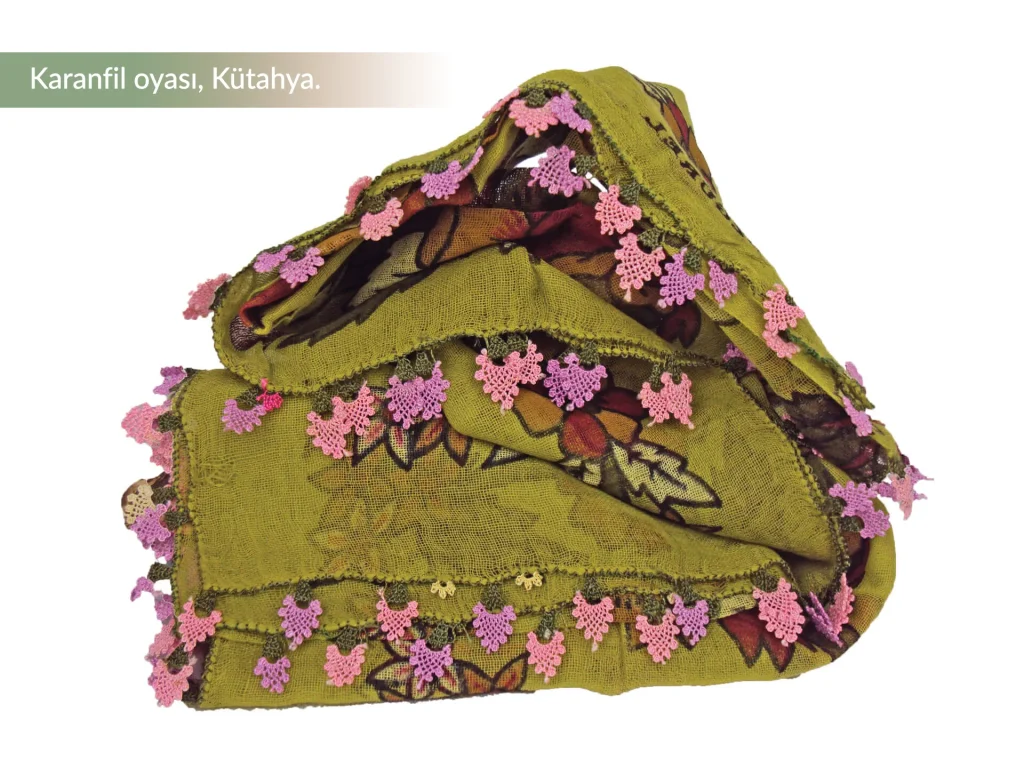 Her il ve bölgenin oyası kendine has özellikler içerir. Bazen renk, büyüklük, bazen de bir sıradışı motif o yörenin imzası olur. Botanik bahçesi oluşturur gibi çalışan, oyalarıyla bu bahçenin çiçeklerini, gönülden, düğümlere aktararak yapan tasarımcılarımız var. Çok marifetli bölgelerimizden Kütahya’nın zembil oyası, zor ve emek isteyen bir oya olduğundan kayınvalideye verilen yazmanın kenarındadır. Kayınvalide tarafından geline hediye edilen gelinparmağı oyalı yazma memnuniyet ifadesinin yanında “Gelinimin on parmağında on marifet ve hüner var” demektir.