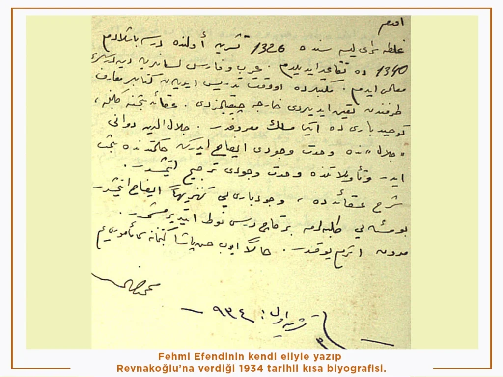 Şeyh Fehmi Efendi uzun boylu, yakışıklı, güzel yüzlü, gözleri içinden gülen, uzunca beyaz sakallı, pembe tenli, sevimli, mübarek, müeddep bir insandı. Hocalığından beklenmeyecek derecede çok ileri fikirli ve inkılâpçı idi. Musa Kâzım Efendi gibi sınıfta zaman zaman başını açar ve derslerine Hıristiyan talebeyi de kabul ederdi. Dinî takrirlerinin onlar tarafından dinlenmesinden, takip edilmesinden mahzuz olurdu, fakat hiçbir telkinde bulunmazdı. “Başımıza şapka geçirmek değil, icap etse de millet ve memleketin selâmeti ve dünya gidişine uymak için alnımıza put koysak (eliyle de yerini gösterirdi) müslümanlığımızdan bir şey kaybetmiş olmayız!” derdi. Bu derece serbest, yüksek görüşleri vardı.