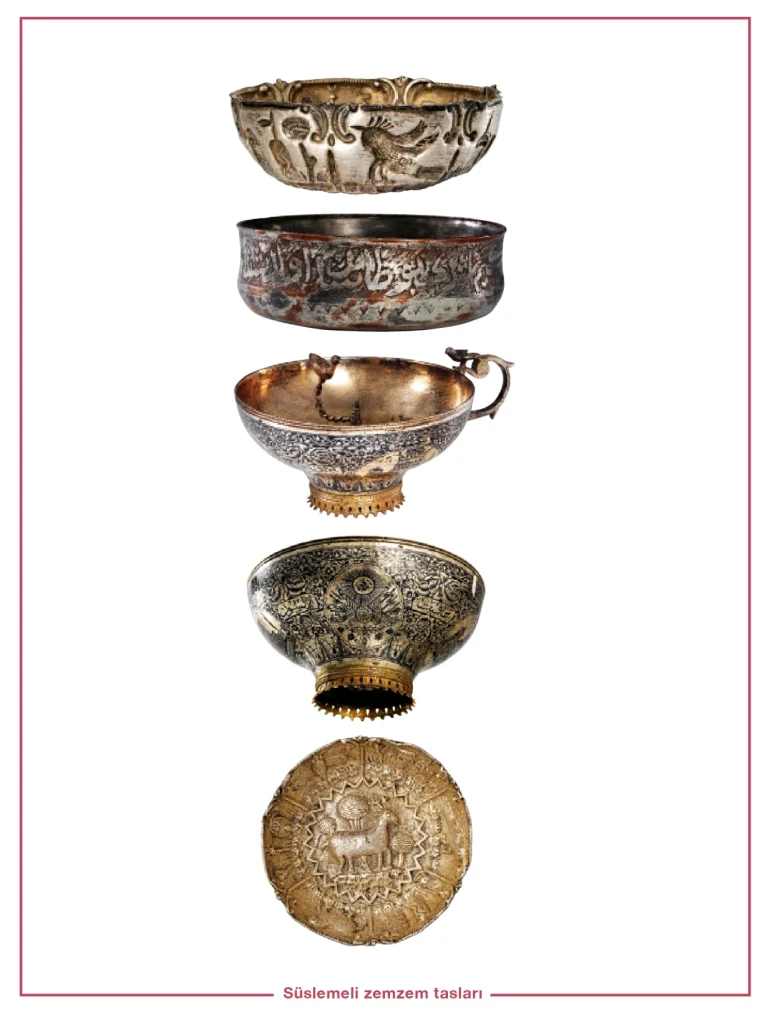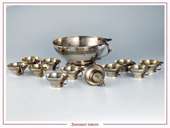 Aslen Mısır’ın yerlilerinden olan sahâbe Ebû Râfi`nin Mekke’de zemzem kuyusunun yanında ağaçtan oyduğu su tasları, bilinen en eski zemzem kaplarıdır. Zamanla zemzemi taşımak ve ikram etmek için çok çeşitli eşyâlar îmal edildi. Topkapı Sarayı Müzesi’nde sergilenen kıymetli taşlarla süslü altın zemzem ibrikleri, bu alandaki en estetik kap tasarımları olarak kabul edilebilir. Zemzem koymaya mahsus üretilen sırça kap veya şişeye “Zevrak” denir. Oldukça estetik olan ve kolay kırılan zevrakla gönül arasında ilişki kuran Şeyh Gâlib’den İsmail Dede Efendi’nin mâhur makâmında bestelediği aşağıdaki mısrâları meşhurdur: